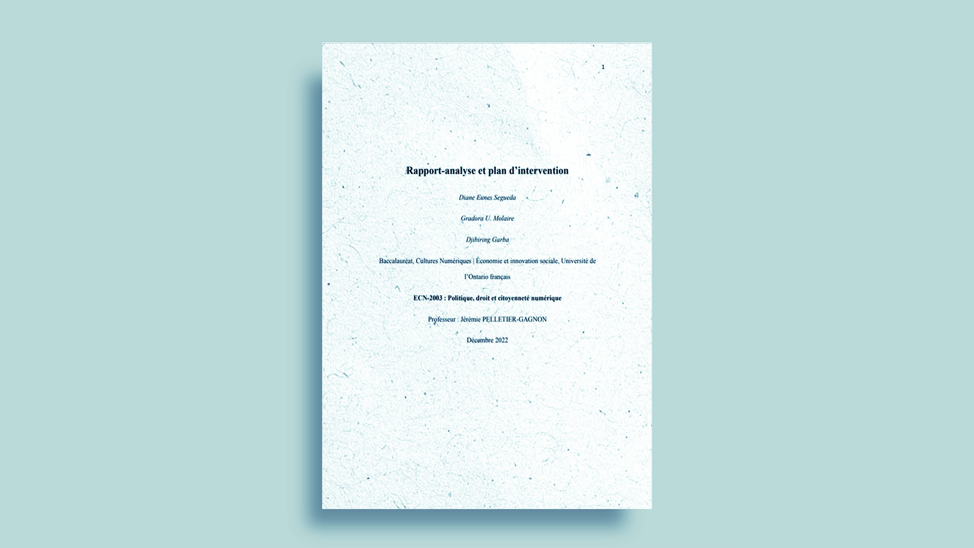 À travers une enquête approfondie et un plan d’intervention numérique, Diane Eunes Segueda, Gradora U. Molaire et Djibiring Garba abordent les enjeux de la littératie numérique dans le contexte professionnel. Ce projet final vise à sensibiliser aux transformations technologiques du monde du travail et à promouvoir l’acquisition de compétences numériques fondamentales. En s’appuyant sur des données d’enquête menées auprès d’étudiant·e·s, le rapport met en lumière l’importance croissante des outils numériques, les inégalités d’accès et les écarts de compétences, notamment en fonction du genre. Le plan d’intervention propose la création d’une plateforme éducative gratuite et interactive, pensée comme un levier pour renforcer l’agilité numérique des travailleur·euse·s. Ce travail met en relation les données empiriques, l’analyse critique et des solutions concrètes, avec un objectif clair : outiller les individus face à un monde professionnel en pleine mutation numérique, et contribuer à une transition technologique plus inclusive et équitable.