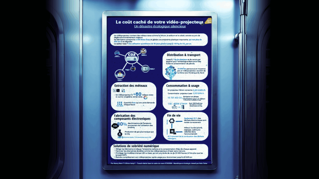 Cette affiche révèle les impacts cachés des vidéoprojecteurs : extraction de métaux rares, forte consommation d’eau et d’énergie, déchets toxiques… et propose des solutions pour réduire leurs empreinte écologique.